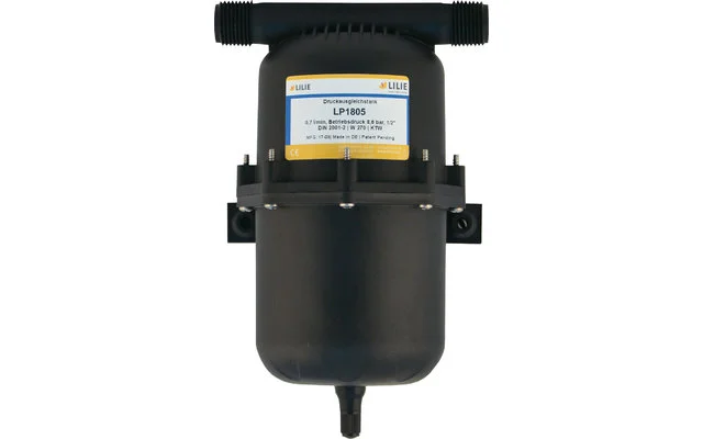 An air bubble with constant pressure is enclosed by a flexible membrane. The pressure of the air bubble is preset to 1.4 bar and can be changed with a bicycle pump. Optimum function when this value is close to the restart pressure of the pump.