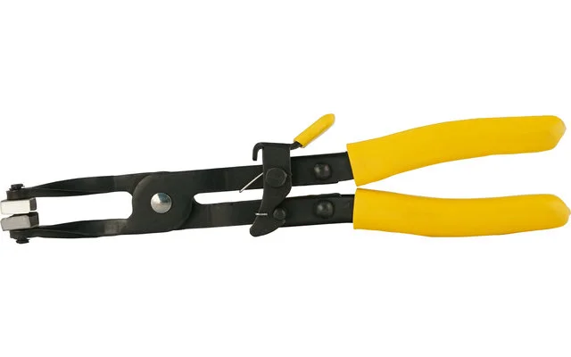 Pliers for spring band clamps with special attachments that fit exactly into the guiding pins of the LILIE spring band clamps. With locking lever for force-saving assembly.