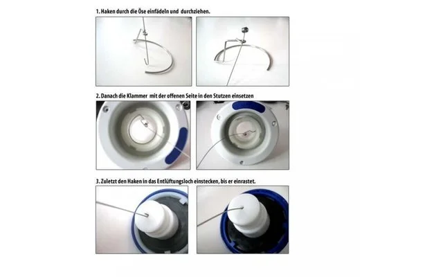 Fee the hook through the eyelet and pull. Insert the clip with the open side into the nozzle. Finally, insert the hook into the ventilation hole until it engages.