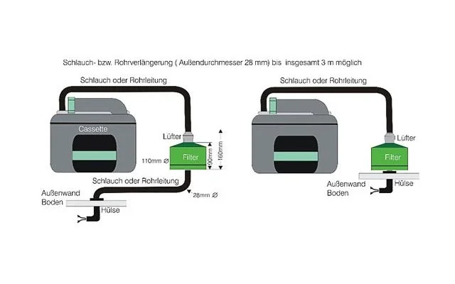 The SOGII offers the advantage that the filter cartridge can be placed very variably at the most different places in the camping vehicle and is vented at any place over the ground (e.g. in the garage, under the seat bench, in the double bottom or in the storage compartment).Both before the compact unit, and to the ground outlet a hose, or pipe extension (up to three meters from the toilet) can be attached around a suitable place to find.